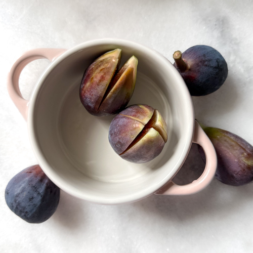 The first crop of figs arrives in the market around May and continues throughout early summer. Since figs generally aren’t available year-round, they’re a treat that deserve to be showcased when you find them. In a recipe such as this, a touch of savoriness adds even more complexity to their deep sweetness.