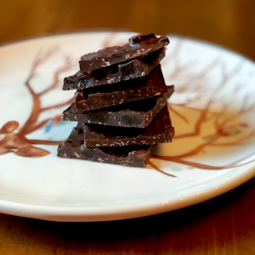 A dark pool of bittersweet chocolate, dried apricots dripping in honey, and a bit of salt sitting on the counter create a satisfying push and pull even before this confection comes together. Sweetness will be tempered. When the fluidity of stirred chocolate is interrupted by the addition of dried coconut, feel yet another pull – the disruptive change from smooth to speckled.